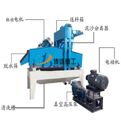 細(xì)沙回收機(jī)整套設(shè)備主要由振動(dòng)電機(jī)、真空高壓泵、泥沙分離器、脫水篩、清洗槽、返料箱等組成。