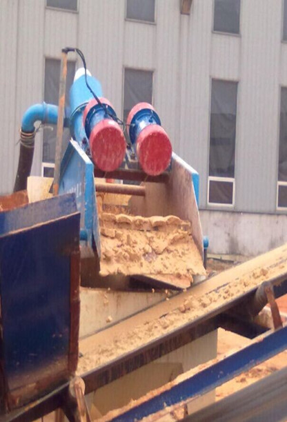 細(xì)沙回收機(jī)泵將砂水混合物輸送至泥沙分離器,離心分級(jí)濃縮的細(xì)砂經(jīng)沉砂嘴提供給振動(dòng)篩,經(jīng)振動(dòng)篩脫水后,細(xì)砂與水有效分離,少量細(xì)砂等經(jīng)返料箱再回到清洗槽,清洗槽液面過(guò)高時(shí),經(jīng)出料口排出。直線(xiàn)振動(dòng)篩回收物料重量濃度為70%-85%。調(diào)節(jié)細(xì)度模數(shù)可通過(guò)改變泵轉(zhuǎn)速、改變砂漿嘗試、調(diào)節(jié)溢流水量、更換出砂嘴來(lái)實(shí)現(xiàn)。